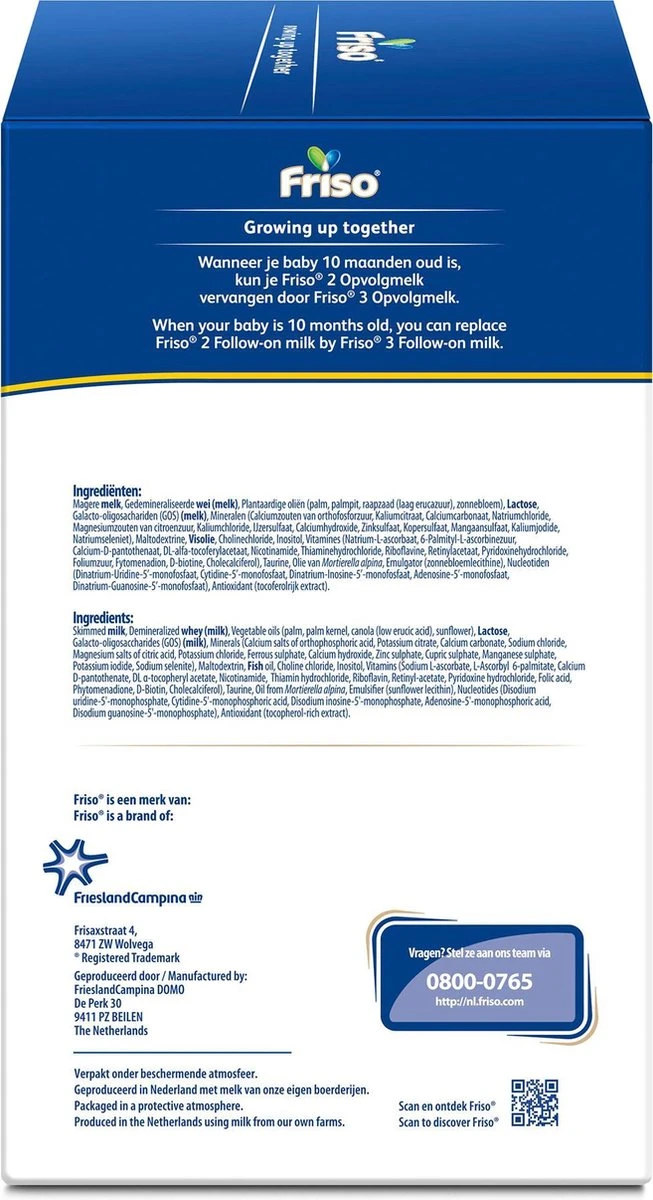 Deze flesvoeding wordt geproduceerd in Nederland. Friso is een merk van FrieslandCampina, een van de grootste zuivel coöperaties ter wereld met 150 jaar ervaring. Friso is wereldwijd beschikbaar in meer dan 20 landen.